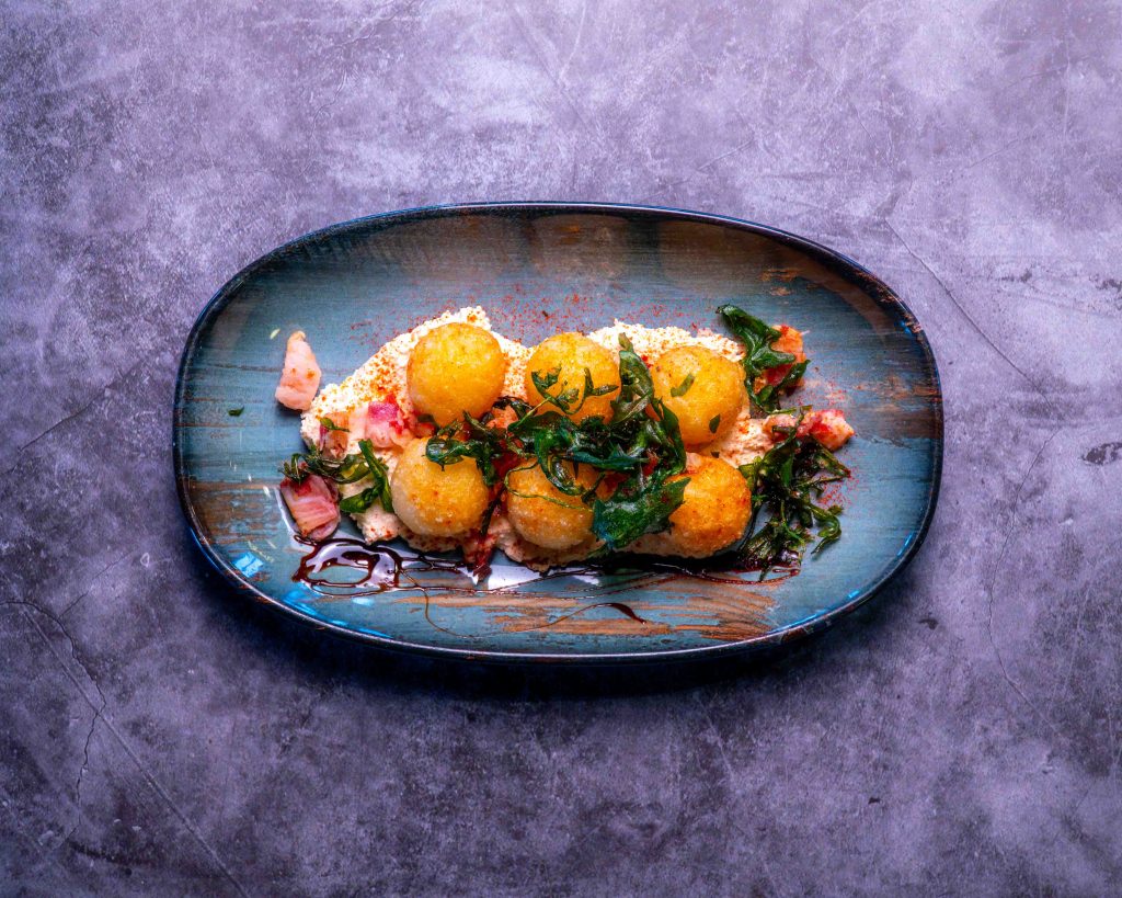 (cheese, cream, tapioca flour, eggs, fried arugula, bacon, ground paprika) ALLERGENS: egg, milk / RECOMMENDATION: Sauvignon Vina Hren